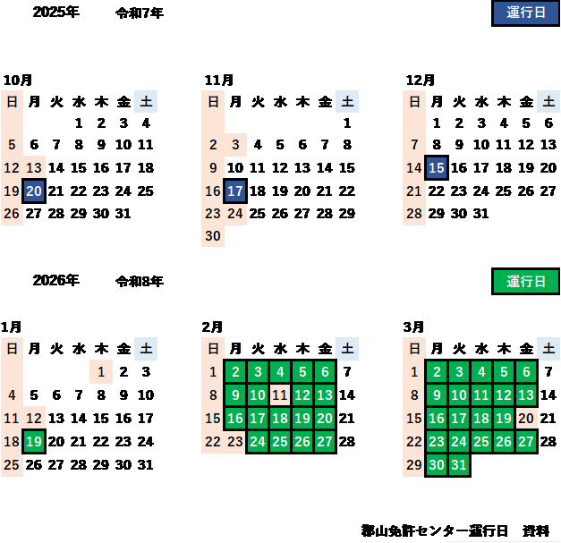 高速バス_郡山運転免許センター 高速バスのご利用案内 【郡山運転免許センター】 運行日について 時刻表について 運賃について ご利用方法について その他の情報 運行日について 受験高速バス「郡山運転免許センター」運行日は、 4 月 1 日 ~ 7 月 31 日 10 月 1 日 ~ 1 月 31 日 第三月曜日運行(祝日の場合翌日運行) 8 月 1 日 ~ 9 月 30 日 毎週月曜日運行(祝日の場合翌日運行) 2 月 1 日 ~ 3 月 31 日 月~金曜日運行(祝日の場合運休) 土曜・日曜・祝日・年末年始の運行はありません 時刻表について 運賃について 2019年10月1日運賃改定 片道運賃 往復乗車券 いわき市内~ 郡山運転免許センター ・なりた温泉 2,500円 5,000円 ご利用方法について ○『いわき⇔郡山運転免許センター・なりた温泉』線は、予約が可能です。 ご乗車の2週間前からご乗車前日の18時まで、新常磐交通各窓口・高速バス予約センターにて 予約を受け付けます。 なお、当日空席がある場合には予約なしでもご乗車いただけますが、 予約されたお客様のご乗車が済むまでお待ちいただくようになりますので、ご了承ください。 ※バス車内で現金精算の際は、釣銭の無いようご協力をお願いいたします。 ○電話予約先 新常磐交通高速バス予約センター・・・0246-46-0222(受付 8:30~18:00) ◎運賃は下記窓口で事前に乗車券をお求めいただくか、バス車内でお支払いください。 【乗車券発売窓口】新常磐交通いわき駅前案内所 ◎座席は全席指定となっております。乗車券に記載された席をご利用ください。 お手回り品は荷物棚かトランクへ収納願います。 サーフボードや折りたたみ自転車等の大型荷物の持ち込みはお断り致します。 なお、滅失・き損等につきましては当社では補償いたしかねますので、ご注意ください。 その他の情報 ○途中休憩はありません ○関連情報 いわき市の天気 郡山市の天気 ※別ウインドウが開きます。